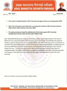 प्रिशा शाह आत्महत्या प्रकरण : केआईआईटीविरूद्ध तत्काल कडा कारबाही गर्न एबीभीपीको माग