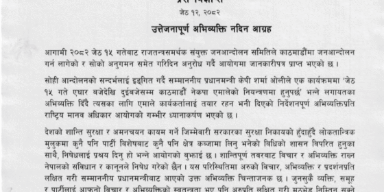 काठमाडौं, जेठ १३ – राजतन्त्र समर्थक संयुक्त जनआन्दोलन समितिले जेठ १५ गतेदेखि काठमाडौंमा सुरु गर्न लागेको आन्दोलनको सन्दर्भमा प्रधानमन्त्री केपी शर्मा ओलीले दिएको अभिव्यक्तिप्रति राष्ट्रिय मानव अधिकार आयोगले गम्भीर ध्यानाकर्षण जनाएको छ। आयोगले सोमबार एक विज्ञप्ति जारी गर्दै प्रधानमन्त्री ओलीलाई उत्तेजनापूर्ण अभिव्यक्ति नदिन चेतावनी दिएको हो। प्रधानमन्त्री ओलीले “जेठ १५ गते ११ बजेदेखि २ बजेसम्म […]